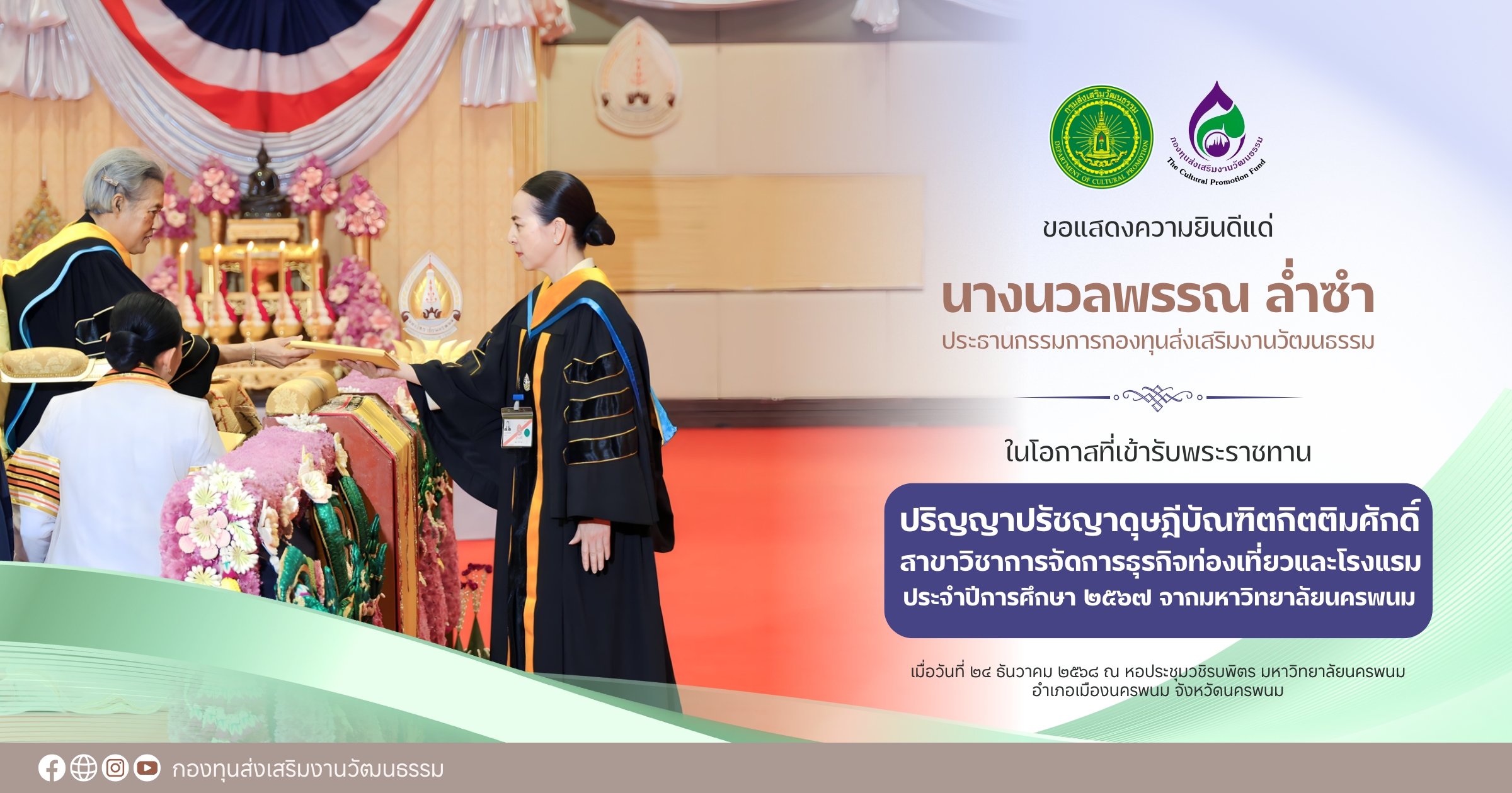 ในการนี้ นวลพรรณ ล่ำซำ (มาดามแป้ง) ประธานกรรมการกองทุนส่งเสริมงานวัฒนธรรม ได้เข้ารับพระราชทานปริญญาดุษฎีบัณฑิตกิตติมศักดิ์ สาขาวิชาการจัดการธุรกิจท่องเที่ยวและโรงแรม กองทุนส่งเสริมงานวัฒนธรรมขอแสดงความยินดีมา ณ โอกาสนี้