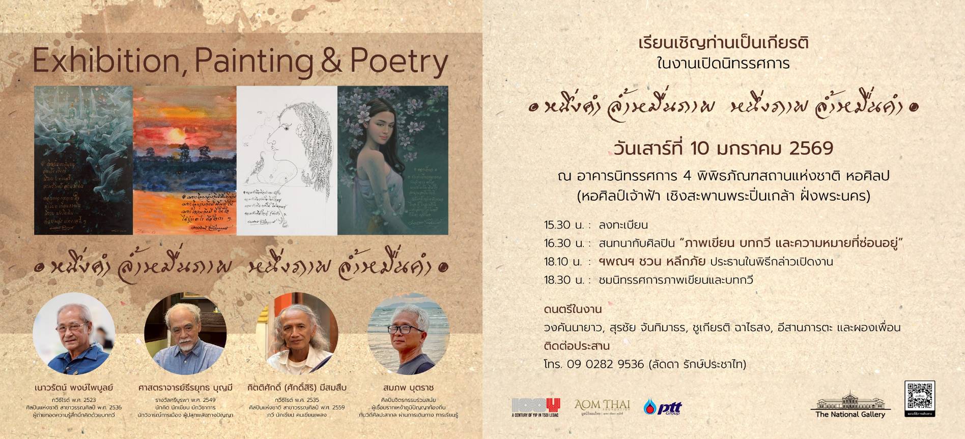 พบกับนิทรรศการ "หนึ่งคำล้ำหมื่นภาพ หนึ่งภาพล้ำหมื่นคำ" นิทรรศการภาพเขียนและบทกวี สะท้อนสัจธรรมของท่านผู้รู้ที่ว่า “ศิลปะส่องทางกัน” จากการบรรจบกันของสองศิลปะ - ส ี่อัตลักษณ์ โดยศิลปินแห่งชาติ ๒ ท่าน คือ นายเนาวรัตน์ พงษ์ไพบูลย์ ศิลปินแห่งชาติ สาขาวรรณศิลป์ (กวีนิพนธ์) พุทธศักราช ๒๕๓๖ และ นายกิตติศักดิ์ มีสมสืบ ศิลปินแห่งชาติ สาขาวรรณศิลป์ พุทธศักราช ๒๕๕๙ และศิลปินอีก ๒ ท่าน ศาสตราจารย์ธีรยุทธ บุญมี และ นายสมภพ บุตราช