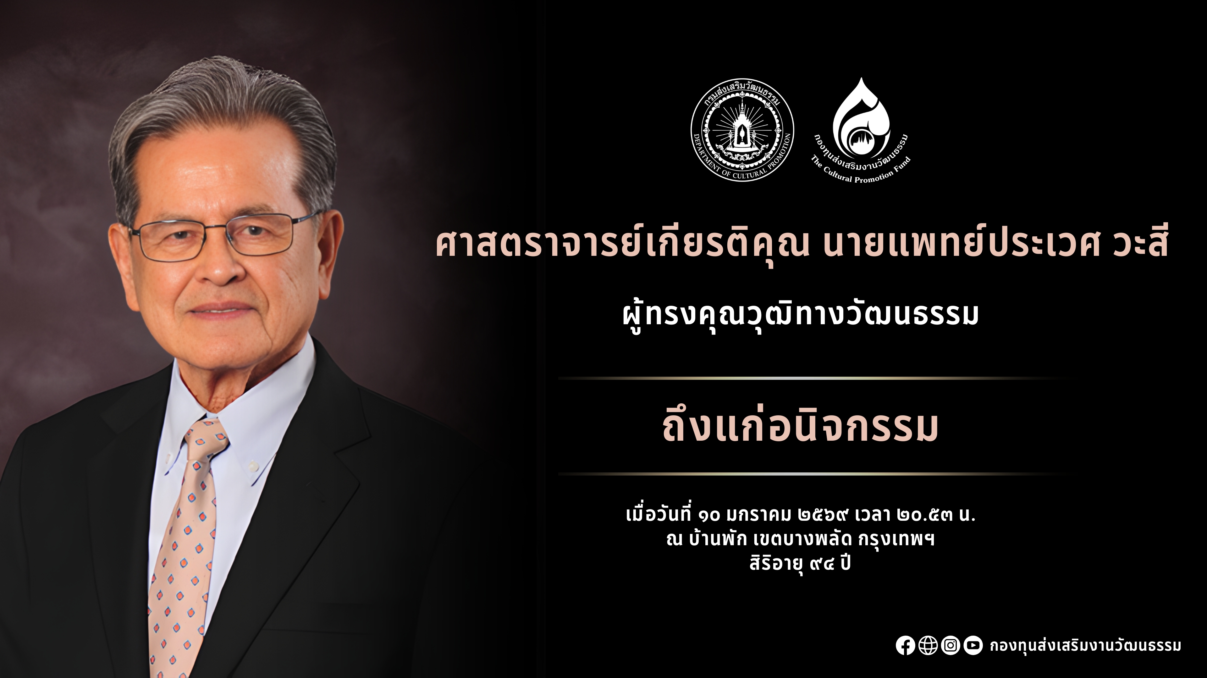 กรมส่งเสริมวัฒนธรรม โดยกองกองทุนส่งเสริมงานวัฒนธรรม ได้รับประสานจากครอบครัวของศาสตราจารย์เกียรติคุณ นายแพทย์ประเวศ วะสี ผู้ทรงคุณวุฒิทางวัฒนธรรม ว่า ศาสตราจารย์เกียรติคุณ นายแพทย์ประเวศ วะสี ถึงแก่อนิจกรรมเมื่อวันเสาร์ที่ ๑๐ มกราคม พ.ศ. ๒๕๖๙ เวลา ๒๐.๕๓ น. ณ บ้านพัก เขตบางพลัด กรุงเทพฯ สิริอายุ ๙๔ ปี กำหนดการสวดพระอภิธรรมและบำเพ็ญกุศล ณ อาคาร ๑๕๐ ปี วัดมกุฏกษัตริยารามราชวรวิหาร เขตพระนคร กรุงเทพฯ