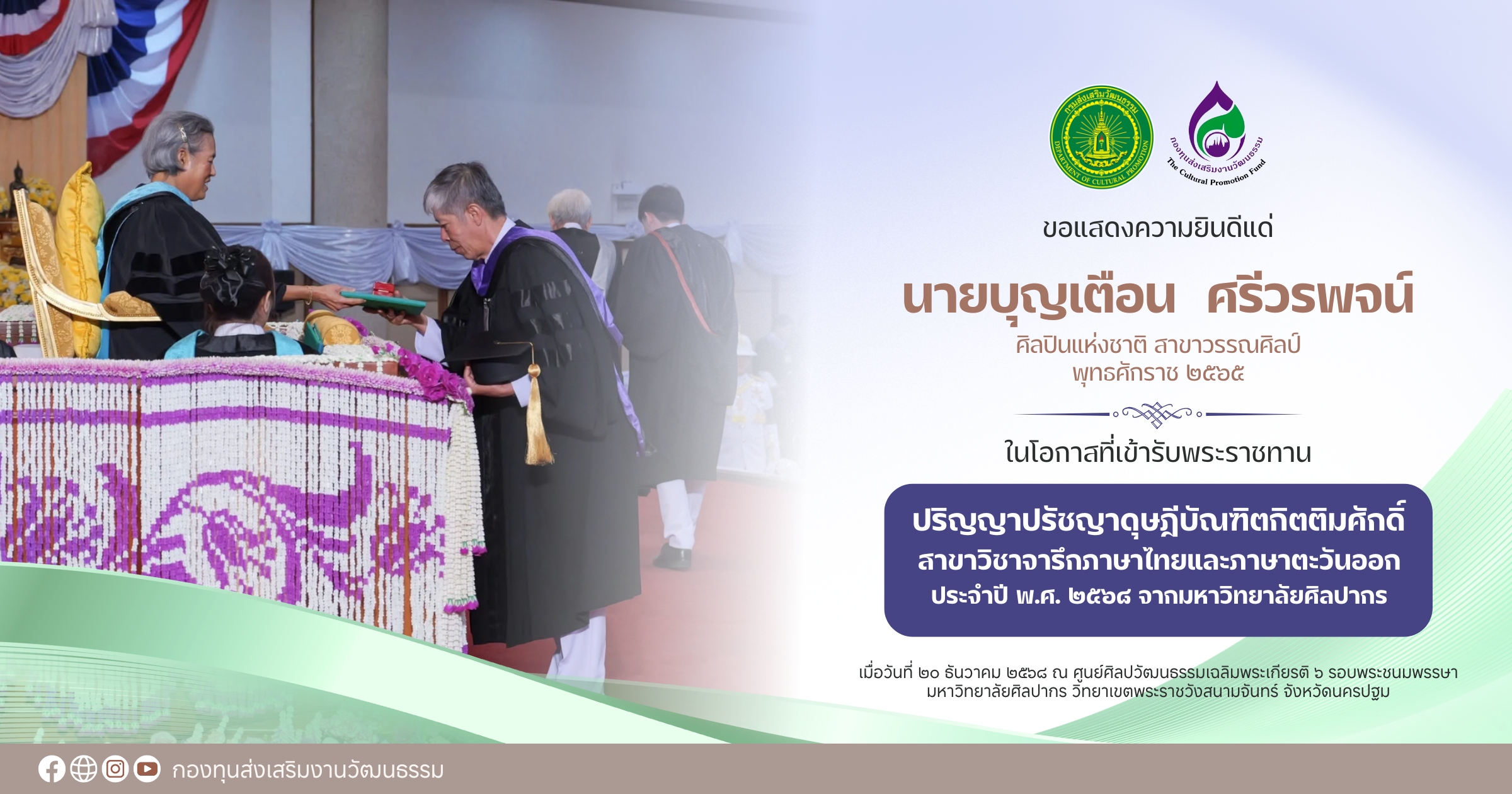ในวาระดังกล่าว ศิลปินแห่งชาติ ๒ ท่าน ได้เข้ารับพระราชทานปริญญาดุษฎีบัณฑิตกิตติมศักดิ์ ได้แก่ ศาสตราจารย์เกียรติคุณถาวร โกอุดมวิทย์ ศิลปินแห่งชาติ สาขาทัศนศิลป์ (ภาพพิมพ์) พุทธศักราช ๒๕๖๔ ปริญญาปรัชญาดุษฎีบัณฑิตกิตติมศักดิ์ สาขาวิชาทัศนศิลป์ และนายบุญเตือน ศรีวรพจน์ ศิลปินแห่งชาติ สาขาวรรณศิลป์ พุทธศักราช ๒๕๖๕ ปริญญาปรัชญาดุษฎีบัณฑิตกิตติมศักดิ์ สาขาวิชาจารึกภาษาไทยและภาษาตะวันออก กรมส่งเสริมวัฒนธรรม และกองทุนส่งเสริมงานวัฒนธรรม ขอแสดงความยินดีแด่ศิลปินแห่งชาติทั้ง ๒ ท่าน มา ณ โอกาสนี้