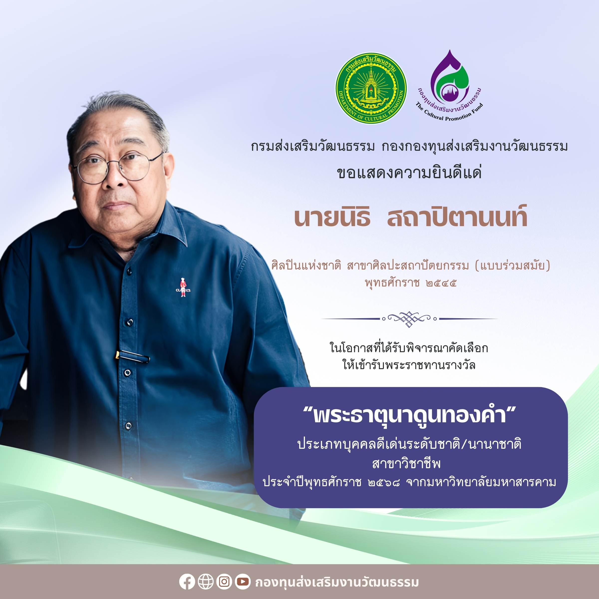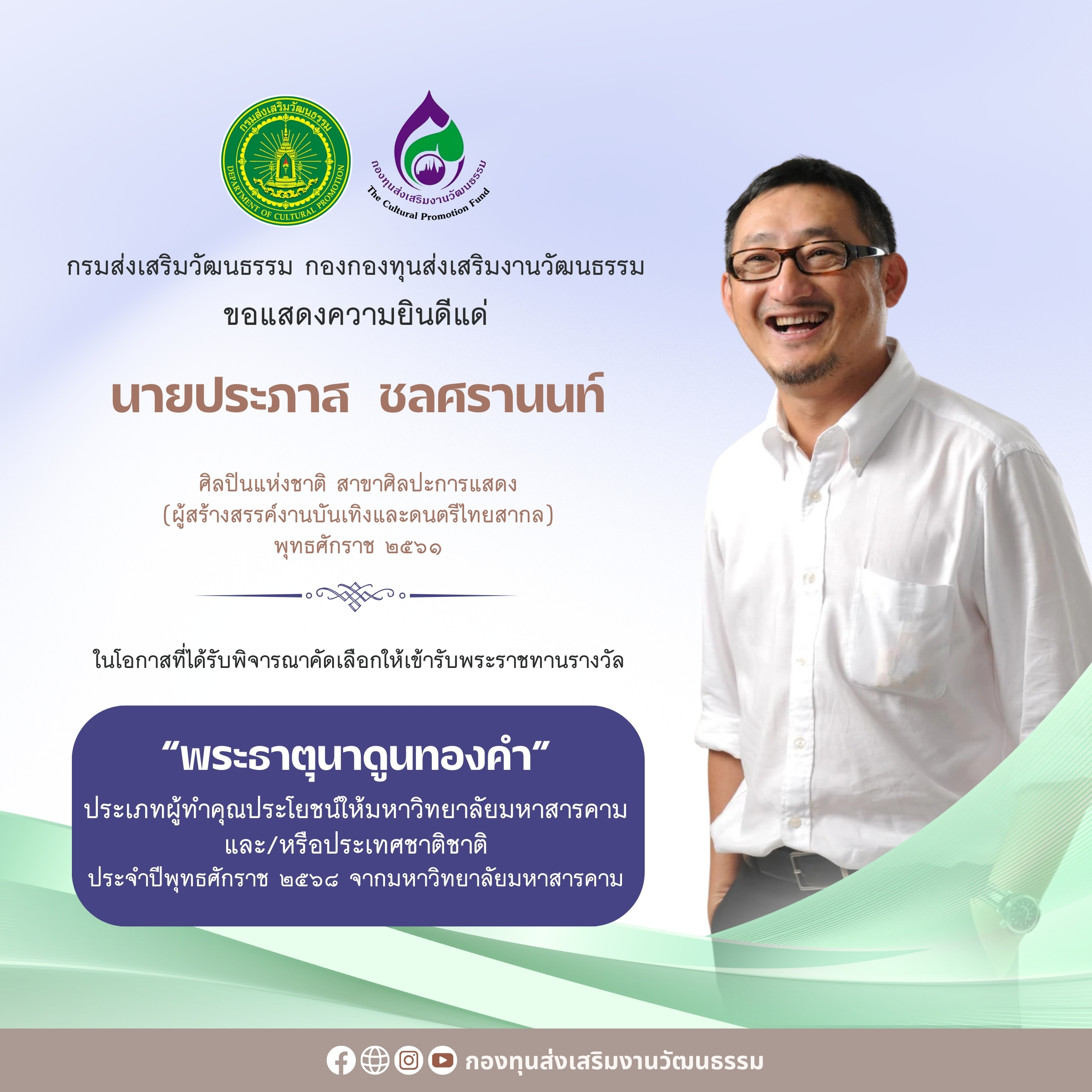 กรมส่งเสริมวัฒนธรรม และกองทุนส่งเสริมงานวัฒนธรรม ขอแสดงความยินดีแด่ศิลปินแห่งชาติ ๒ ท่าน ที่ได้รับพิจารณาคัดเลือกให้เข้ารับพระราชทานรางวัลพระธาตุนาดูนทองคำ ในพิธีพระราชทานปริญญาบัตรแก่ผู้สำเร็จการศึกษาจากมหาวิทยาลัยมหาสารคาม ประจำปีการศึกษา ๒๕๖๗ ในวันที่ ๒๗ เมษายน ๒๕๖๙ ได้แก่ นายนิธิ สถาปิตานนท์ ศิลปินแห่งชาติ สาขาศิลปะสถาปัตยกรรม (แบบร่วมสมัย) พุทธศักราช ๒๕๔๕ ประเภทบุคคลดีเด่นระดับชาติ/นานาชาติ สาขาวิชาชีพ - นายประภาส ชลศรานนท์ ศิลปินแห่งชาติ สาขาศิลปะการแสดง (ผู้สร้างสรรค์งานบันเทิงและดนตรีไทยสากล) พุทธศักราช ๒๕๖๑ ขอแสดงความยินดีแด่ศิลปินแห่งชาติทั้ง ๒ ท่าน มา ณ โอกาสนี้
