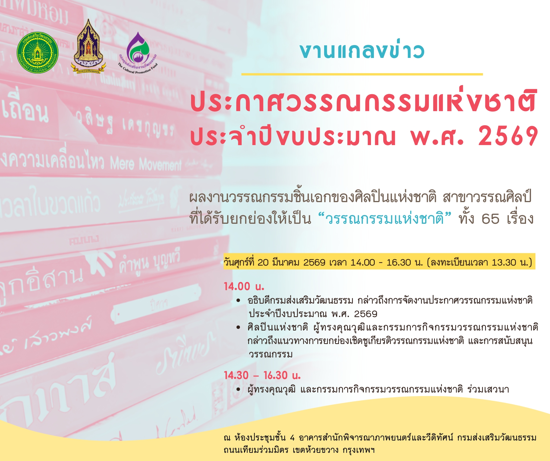 เตรียมพบกับผลงานวรรณกรรมชิ้นเอกของศิลปินแห่งชาติ สาขาวรรณศิลป์ ที่ได้รับยกย่องให้เป็น “วรรณกรรมแห่งชาติ” ทั้ง ๖๕ เรื่อง ภายในงานแถลงข่าวประกาศวรรณกรรมแห่งชาติ ประจำปีงบประมาณ พ.ศ. ๒๕๖๙ ครั้งแรกในรอบ ๑๐ ปี