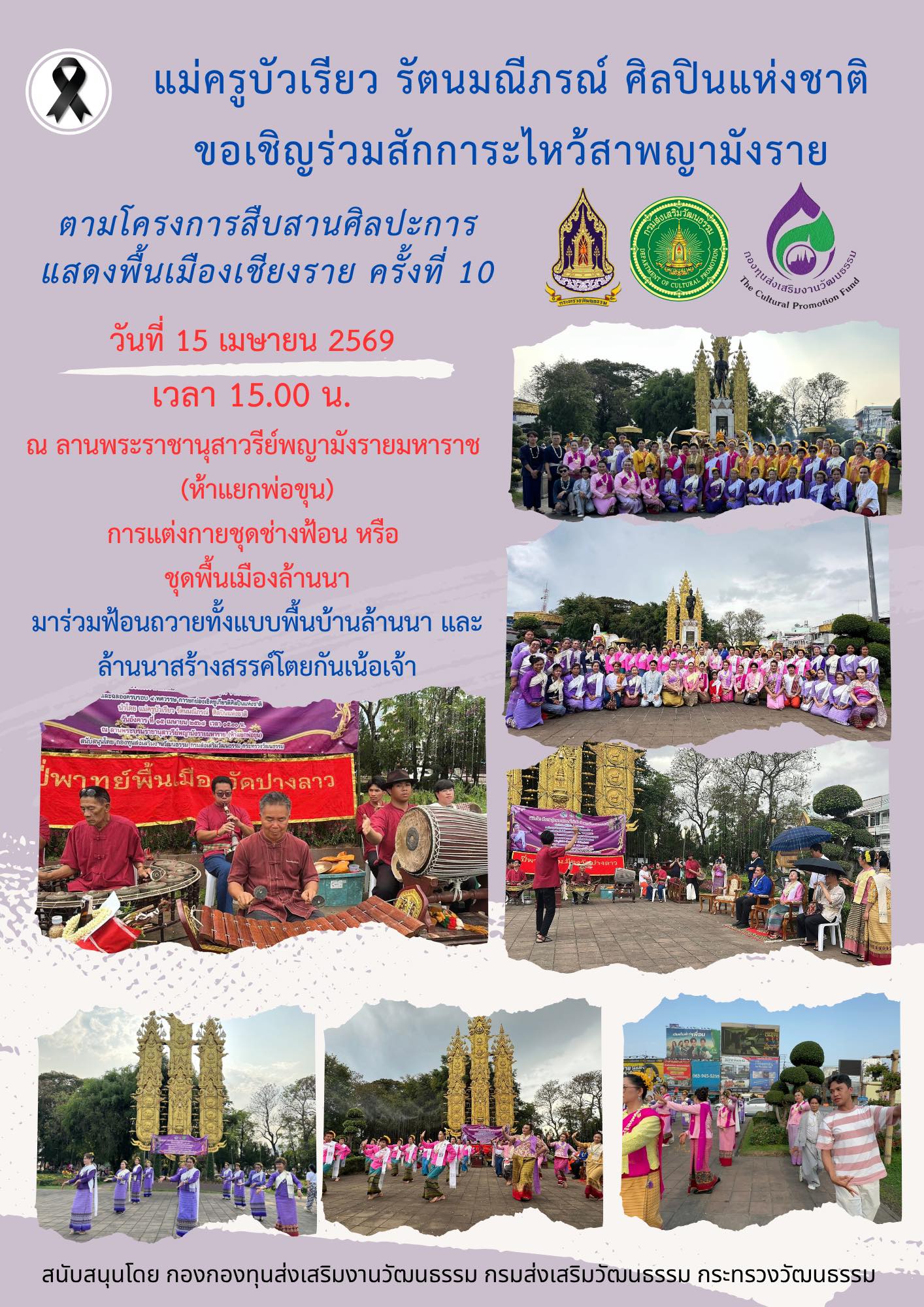 ขอเชิญร่วมสักการะไหว้สาพญามังราย ภายใต้โครงการสืบสานศิลปะการแสดงพื้นเมืองเชียงราย ครั้งที่ ๑๐ โดยนางบัวเรียว รัตนมณีภรณ์ ศิลปินแห่งชาติ สาขาศิลปะการแสดง (การแสดงพื้นบ้าน - ช่างฟ้อน) พุทธศักราช ๒๕๕๙ ในวันพุธที่ ๑๕ เมษายน ๒๕๖๙ เวลา ๑๕.๐๐ น. ณ ลานพระราชานุสาวรีย์พญามังรายมหาราช (ห้าแยกพ่อขุน) อำเภอเมืองเชียงราย จังหวัดเชียงราย